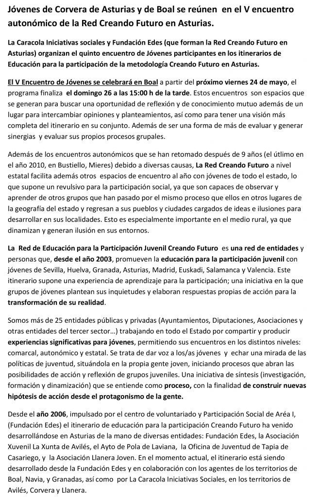 Jóvenes de Corvera de Astuiras y de Boal participarán en el V Encuentro Autonómico de la Red Creando Futuro en Asturias, a desarrollar del 24 al 26 de mayo en Boal.