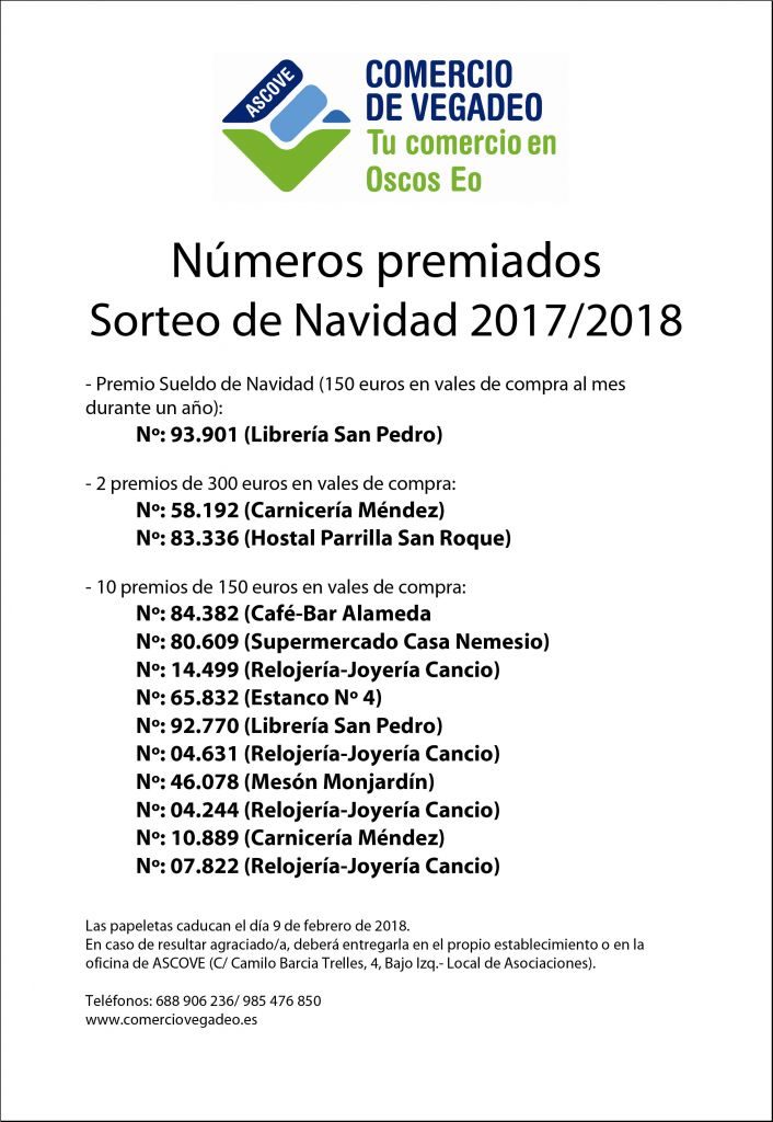 Ascove, el Asociación de comerciantes da Veiga, xa fexo el sorteo de os premios de Navidad y tamén se sabe cuáles foron os tres locales que recibiron premio nel concurso de Escaparates. Hasta el 9 de febreiro poden reclamarse ós premios.