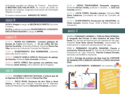 La Feria del Libro de Ribadeo «Letras no Campo», llegará a su octava edición: se celebrará el 14 al 17 de mayo. Habrá presentaciones de libros, conciertos, la proyección de una película y un photocall en el que participan el Coco y la Coca, explica la concejala de Cultura, Pilar Otero. Las casetas abrirán de 11:30 a 13:30 horas por las mañanas y de 17:30 a 20:30 horas por la tarde.